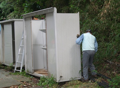 | 8月は夏休みでしたので、久しぶりの活動です。 参加者は10名。倉庫を移動しました。 大きい倉庫は重くて8人でも持てなかったので、屋根を外して移動しました。新しい場所は舗装の上だったので水平を保つのは楽でした。 元の位置に使われていたブロックを使い水準器で水平を保ちました。倉庫にあった道具で、すべてができました。写真で奮闘ぶりが分かるかと思います。 |