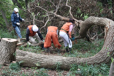 9日はばら苑西口の整備。台風で倒れていた木の切り倒し。めったにない体験。立教大の先生と学生1名がゲスト参加。 木は倒れてからほぼ1月たち乾燥して切りにくくなっていました。切れたのにかかり木になってしまい、方向を変えて再度引っ張りやっと倒せました。もう1本切りかけの木が在り、それも処理しました。 参加者は8名ゲスト2名計10名でした。作業後は広々として気持ち良い空間になりました。 |