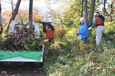 10月13日、バラ苑西口付近で下草刈り。参加者9名。オトコエシ野群落が出来ていました。そこだけ日当たりが良いのです。隣接の民有地の杉を切れれば日当たりが良くなって、花が沢山咲きそうです。残念です。手い入れをしても花が咲かないと思っていらのですが、民有地の竹がどんどん枯れていて、こちらに日が当たるようになってきています。日が当たれば花が咲くを実感しました。19日の区民祭の日に指定管理者がブースを作り、マネジメント会議の参加団体のチラシを配布するから原稿を用意するおゆににとのことで、集合写真を取りました。 |
