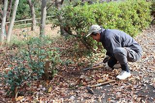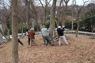 | 1月12日は飯室山展望下で作業。参加者は14名。 笹刈り。台風で落ちたらしい枯れ枝が多かった。笹の中にはスミレやタマノカンアオイが多い。春ここはスミレが一面に咲き園路からも見えるほど。 作業後新年会。暖かくて良かった。 杉が切れるか検討。その際に横の桜がほぼ枯れていることが分かった。枯れ枝は園路に落ちる。今すぐ危険ではないけどいずれ危険になる。 |